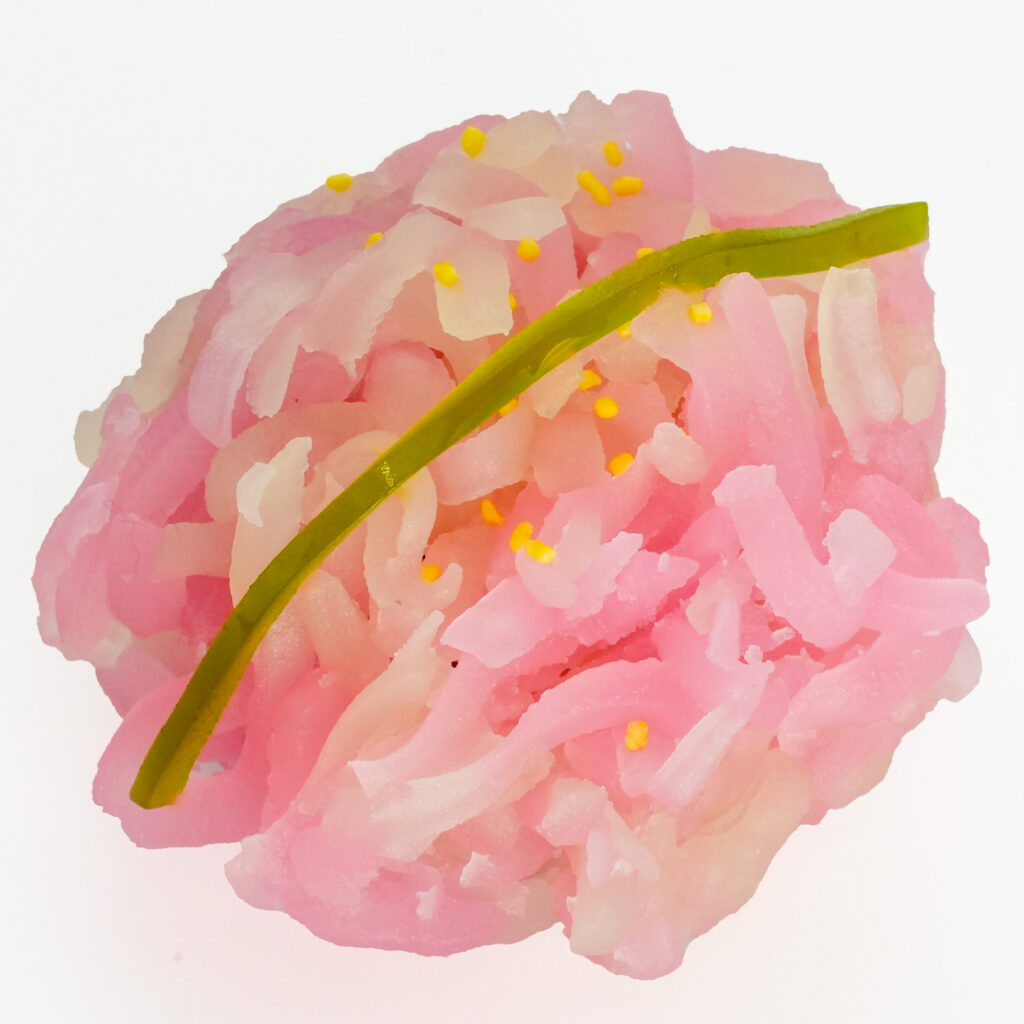 ピンク色と白色のきんとんを、小豆つぶしあんを芯にして植え付け、黄色の新引粉を散らしました。緑色の羊かんを乗せてあります。