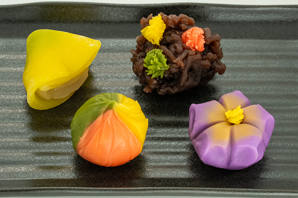 挽き茶色、黄色、オレンジ色の練り切りで、小豆こしあんを包み、布巾でしぼりました。