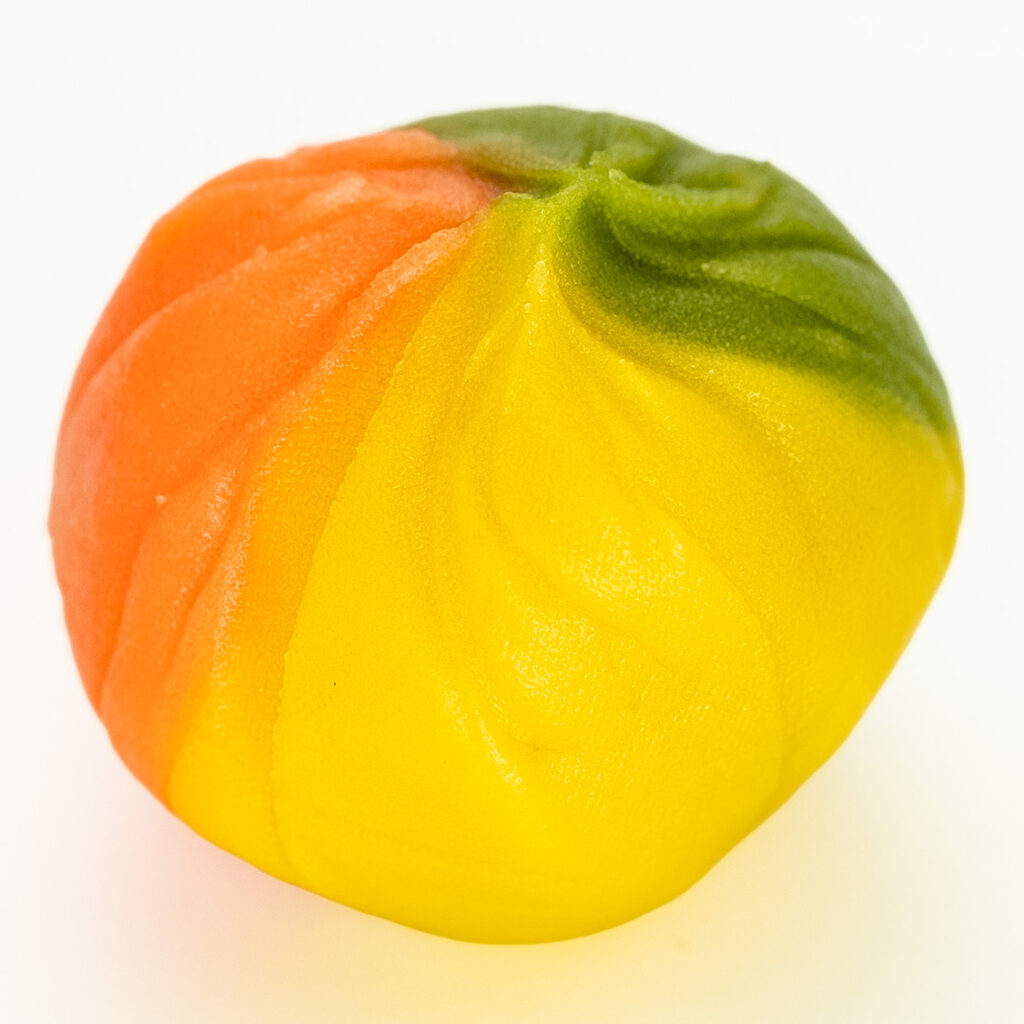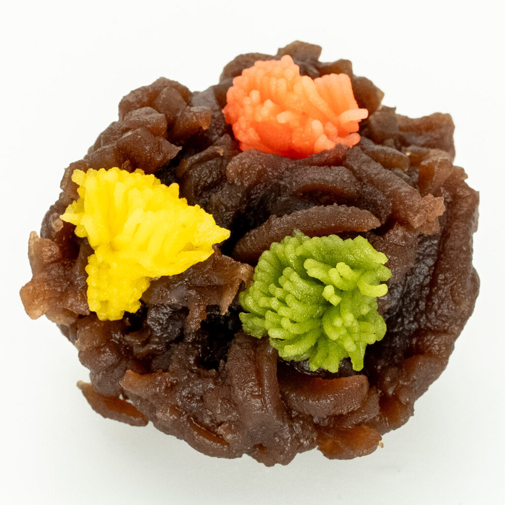 黒糖のきんとんをつぶしあんを芯にして付け、上部にオレンジ色、黄色、緑色の練り切りそぼろを植え付けてあります。