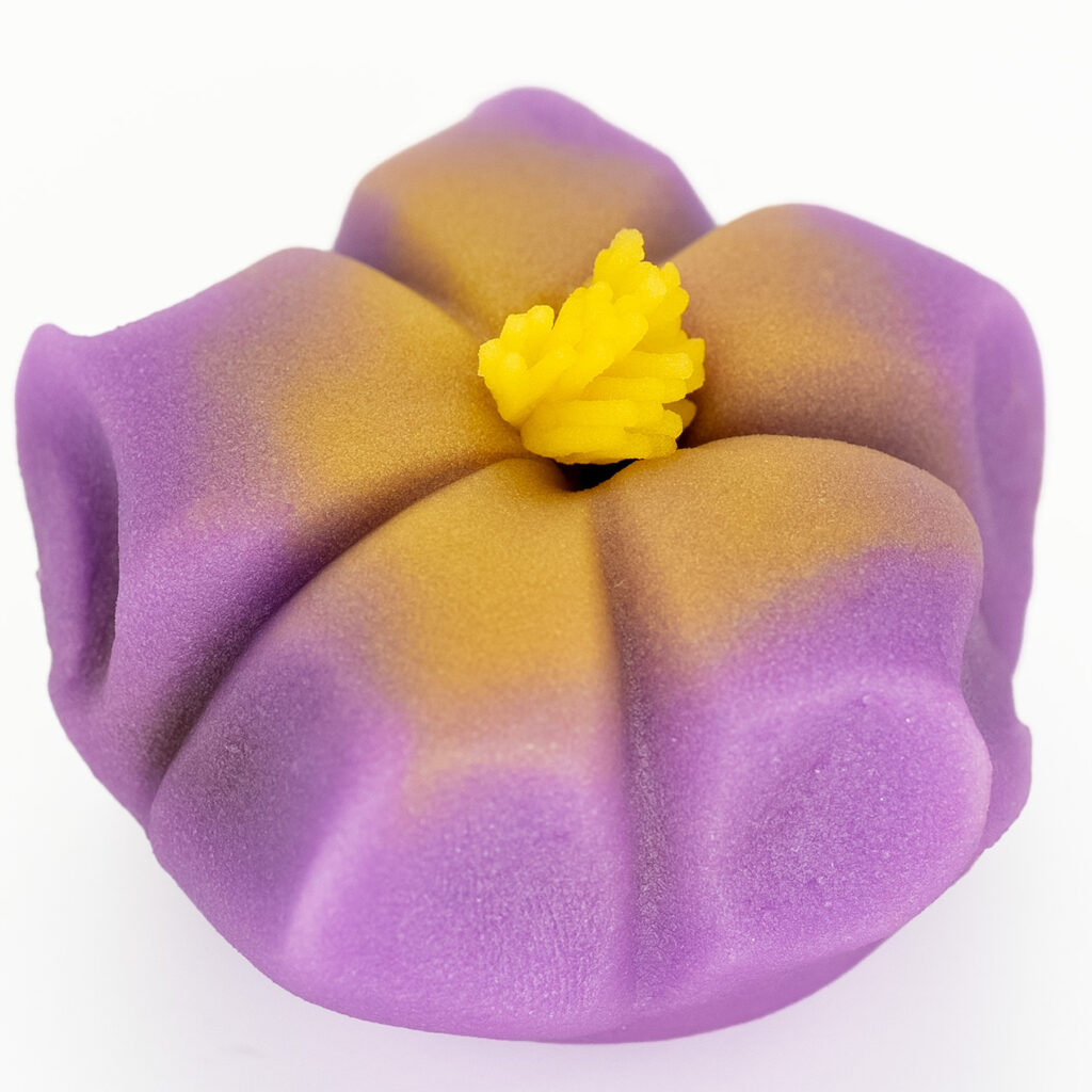 黄色でぼかした紫色の練り切りで、小豆こしあんを包み、手形でりんどうを形どりました。黄色の練り切りでシベをつけました。