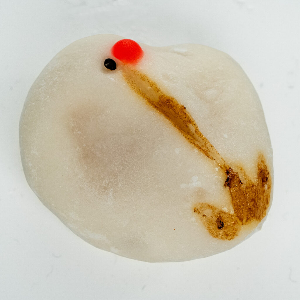 白の雪平で白あんを包み、手型で鶴を形どり、焼きゴテと朱色の羊かんで仕上げました。