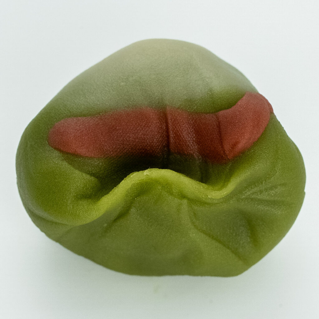 白色でぼかした緑色の練り切りで小豆こしあんを包み、布巾で絞りました。茶色の練り切りを添えて仕上げました。