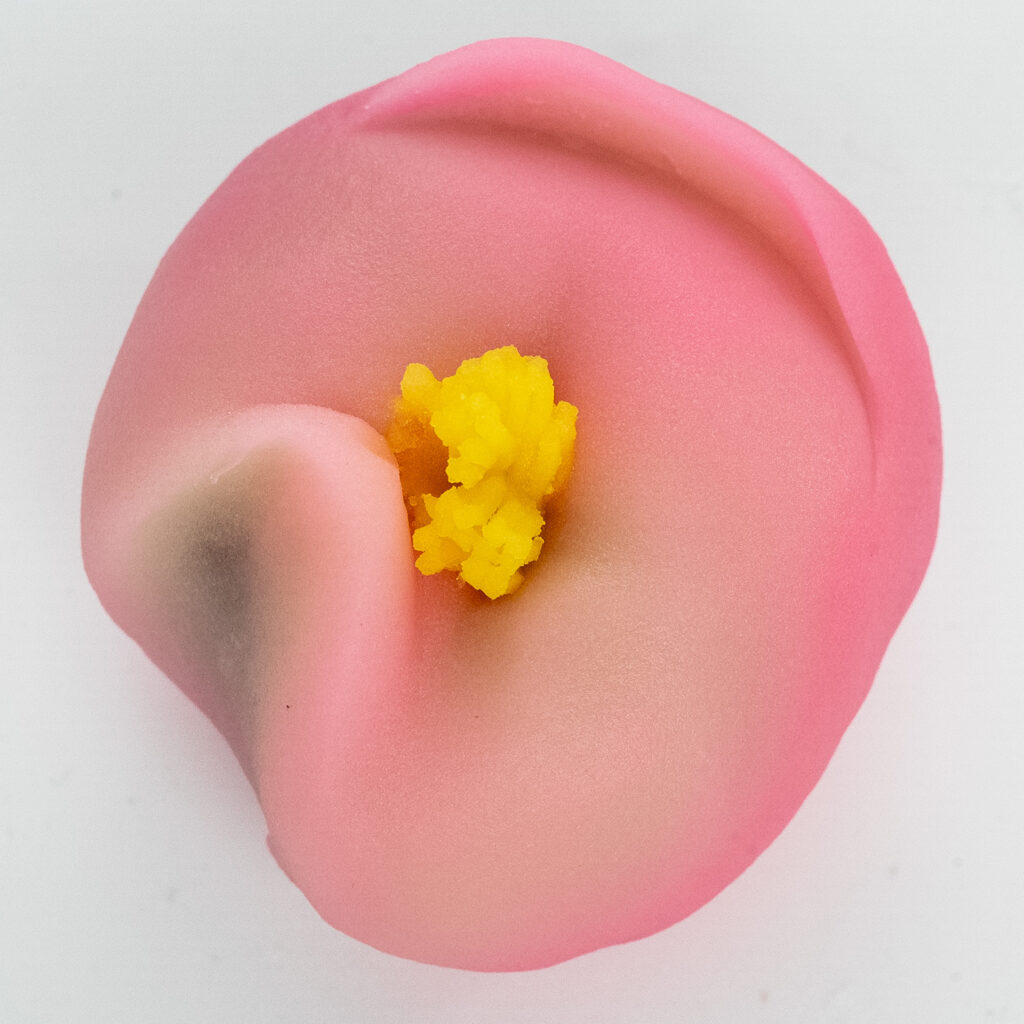 白くぼかしたピンク色の練り切りで、小豆こし餡を包み、手型でかたどりました。黄色の練り切りのシベを乗せました。