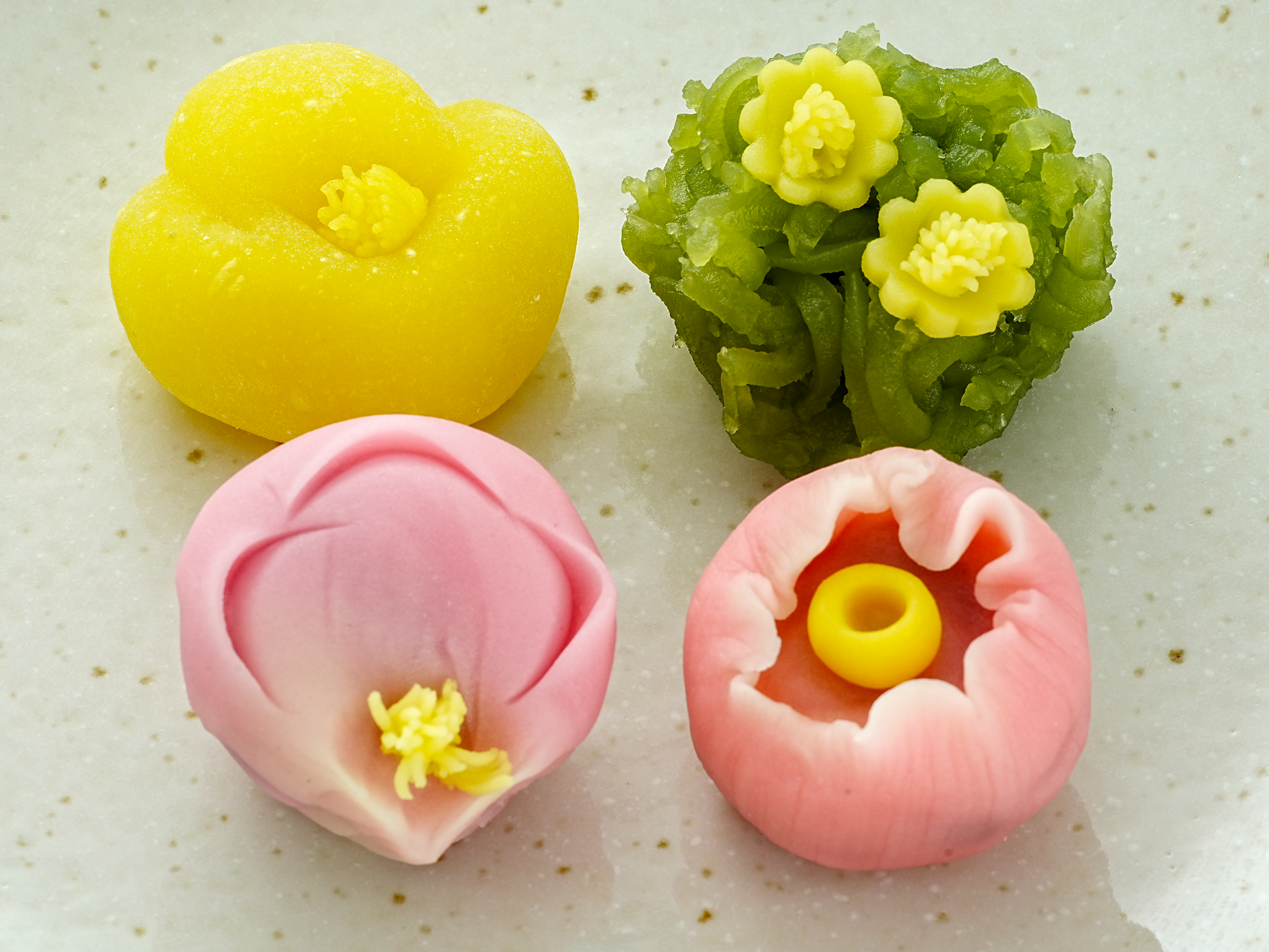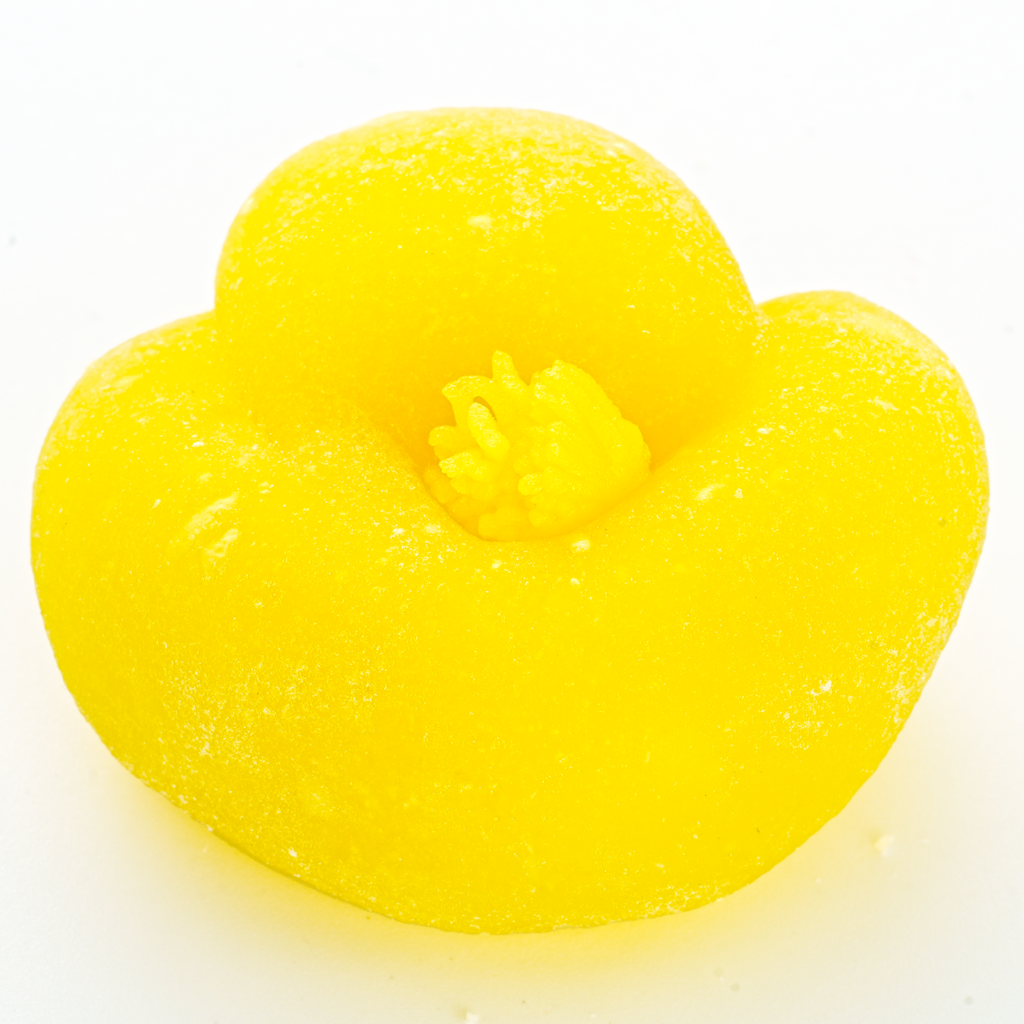黄色のういろうで白あんを包み、ヘラで花弁をかたどりました。黄色の練り切りのシベを添えてあります。