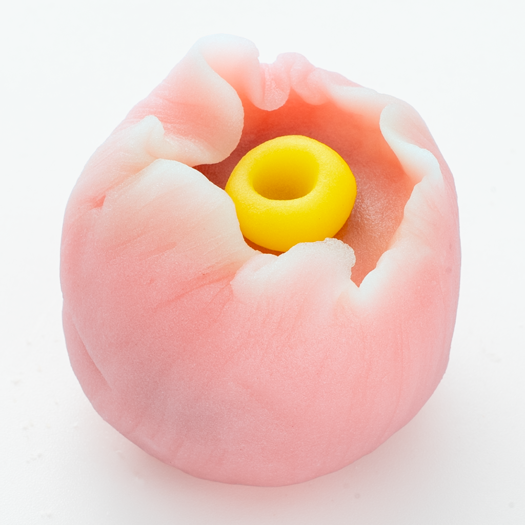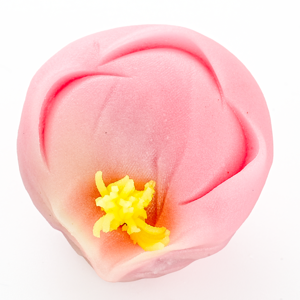 白くぼかしたピンク色の練り切りで、小豆こし餡を包み、手型でかたどりました。黄色の練り切りのシベをつけました。
