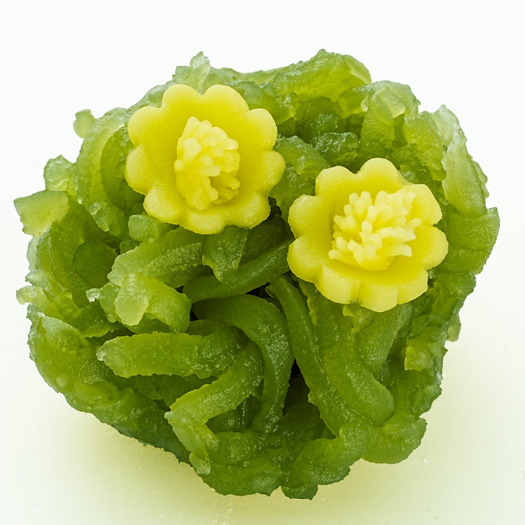 緑色のきんとんを小豆つぶしあんを芯にして付けました。黄色の練り切り製の花とシベを添えてあります。