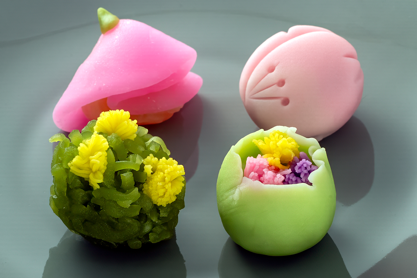 黄緑色ねりきりで小豆こしあんを包み、手形で成形し、紫・黄・ピンク色のねりきりのそぼろを植えつけて仕上げました。