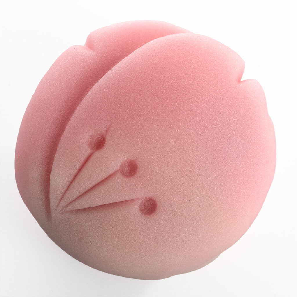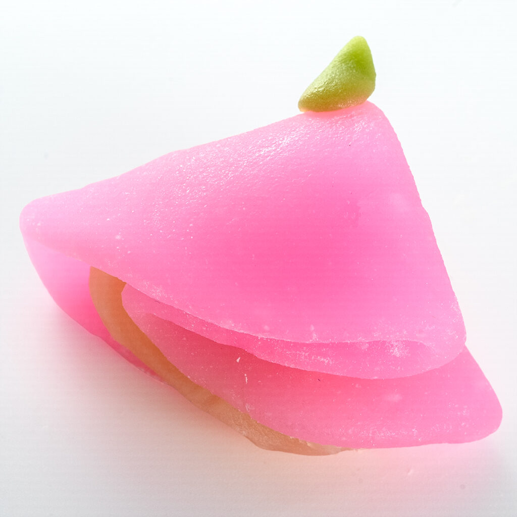 ピンク色ういろうを白あんを芯にして折りたたみ、緑色ねりきり製のガクをつけて仕上げました。
