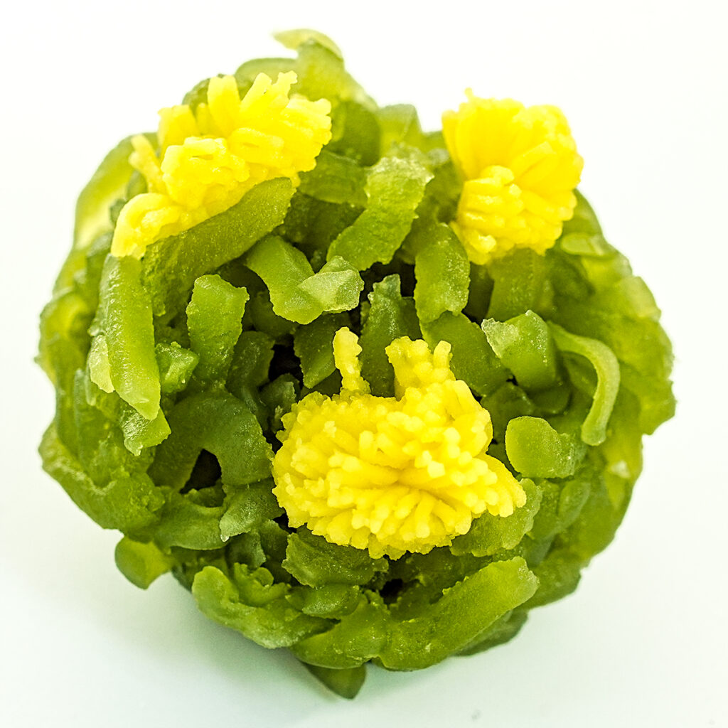 緑色きんとんを小豆つぶあんを芯にしてつけ、上部に黄色ねりきりのそぼろを植えつけました。