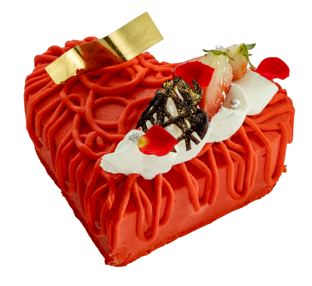 イチゴとホワイトチョコレートのムースにアーモンドの生地、アーモンドのペーストを合わせました。