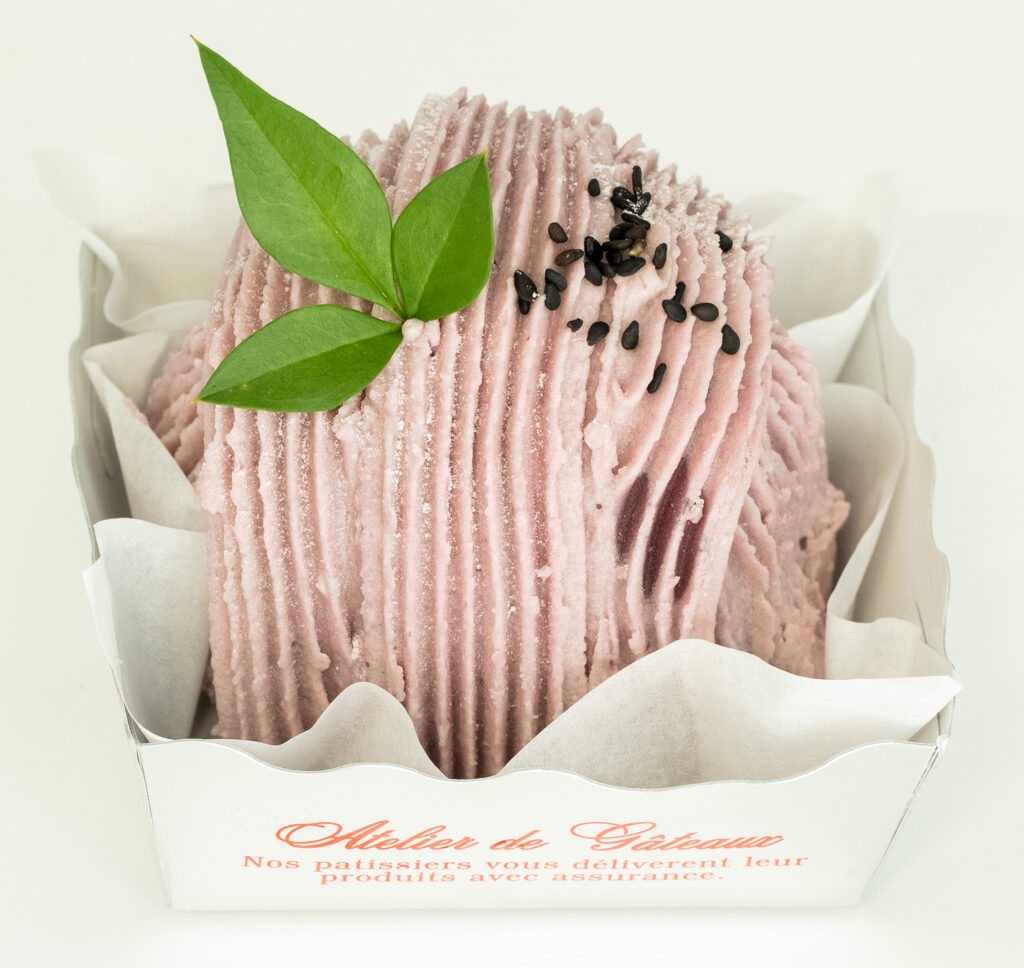 黒ゴマクリームのミニロールケーキの上に、紫芋餡のクリームを絞りました。
