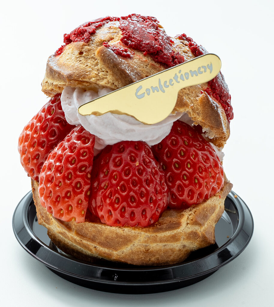 サクサクのクッキーシュー生地にいちごクリーム、木苺ジャム、カスタードクリームをゴージャスにはさみ、盛り付けましたた。
