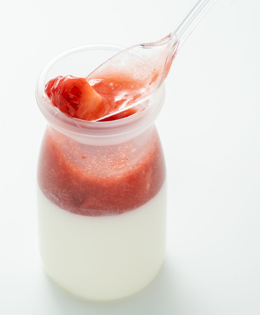 フレッシュな苺をたっぷり入れたソースに、なめらかぷるぷるな杏仁豆腐を合わせました。