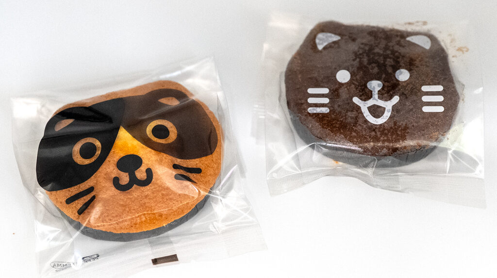 かわいい猫の顔の袋に入ったチョコレート味のマドレーヌとバタ一風味のマドレーヌの2 種類がございます。