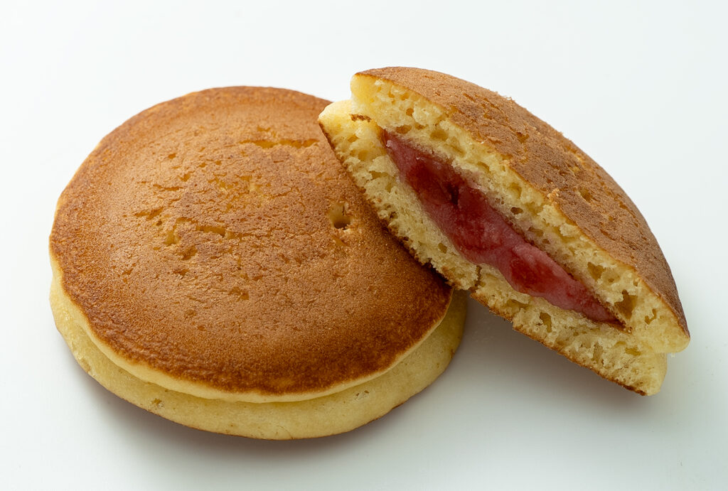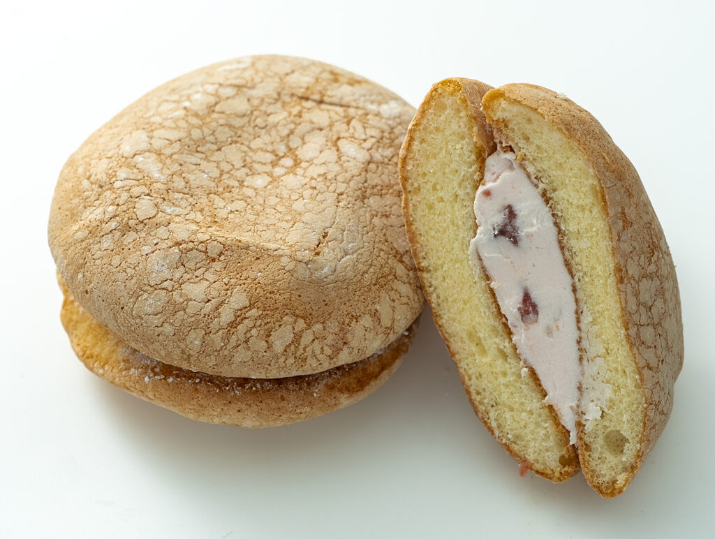 パンケーキ風のフワフワで軽い生地の皮に、酸味のある苺ソースとドライ苺をたっぷりと滉ぜ込んだ特製の苺餡を挟んで仕上げました。